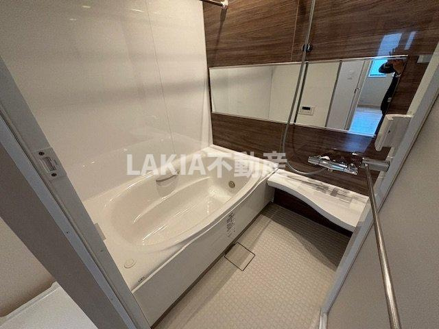 浴室に関しては、複数名様でご入居いただく際には欠かせない追い炊き機能が完備されておりますので経済的にもおすすめです。また、天候が悪い際に役立つ浴室乾燥機も備わっておりますのでその点につきましてもご安心ください。またアクセントタイルはウッド調パネルになっており、ワイドな鏡が採用されているので高級感がございます。