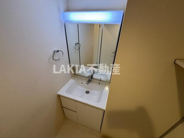 脱衣所につきましては、広くスペースを確保されているので朝の混雑時でも安心かと思います。洗面台に関してはシンプルなデザインですが三面鏡が採用されており収納力抜群です。洗濯機置き場も少しゆとりがありますのでドラム式洗濯機も問題なく設置できます。